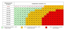 Exemple : une température sous abri de -12°C couplée à un vent de 50km/h, correspond à une température réellement ressentie par le corps humain et les organismes de -34°C. Voir image ci-contre.
